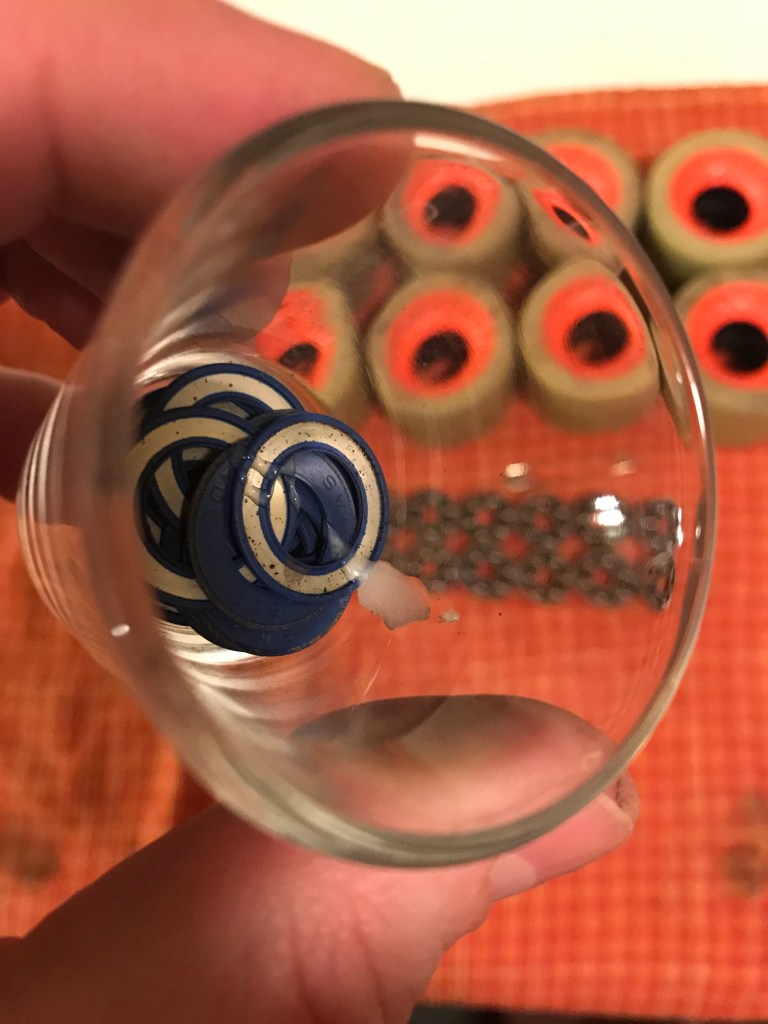 You’ll know your bearings are clean when you spin them on the ale and they spin freely. When you open up the bottle, you’ll see dirt and crud accumulating in the cleaning solution. Depending on how dirty the bearings are that you’re cleaning, you may have to do a few extra rounds of bottle shaking to get them clean.