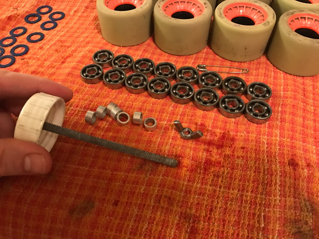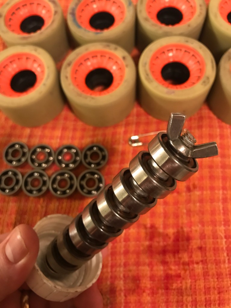 Following the instructions provided with the Bones Bearing Cleaning Unit we’ll place our bearings on the axle (the threaded bolt under the cap) open face up toward the bottom of the cap, alternating from one bearing to one spacer until we’ve got 8 bearings on the axle. Then screw the wing nut on until it’s finger tight. Don’t over tighten.
