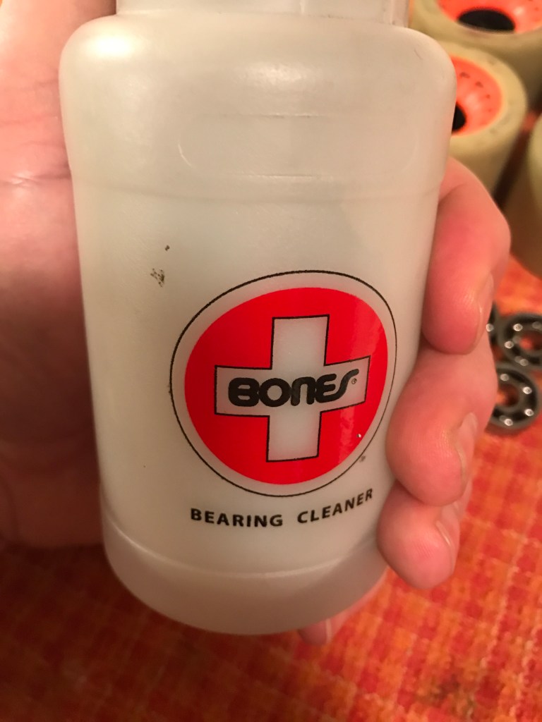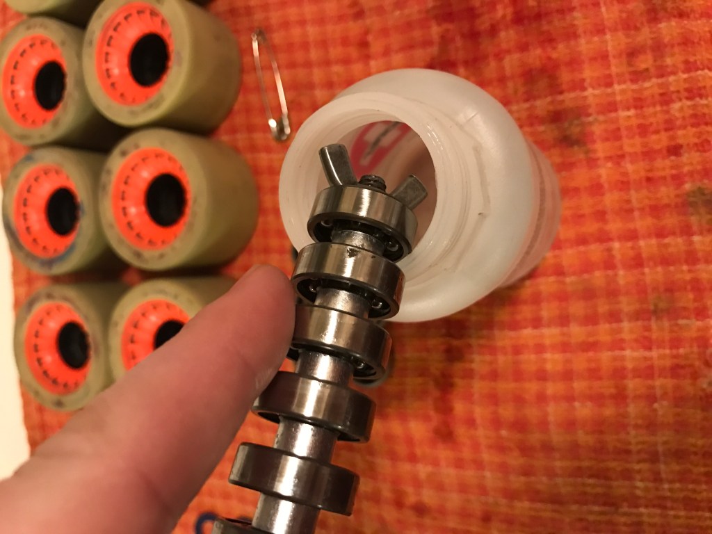 Now we turn our attention to the bearings themselves. For this next step we’ll grab our Bones Bearing Cleaning Unit. It sort of looks like a big vitamin bottle with a threaded axle stuck to the inside of the lid along with some spacers and a wing nut. This item makes cleaning your bearings terribly easy and keeps the process fairly tidy.