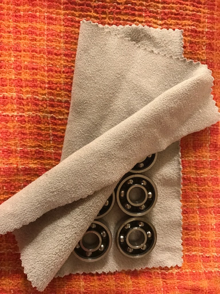 Remove the bearings from the axle and set them on your work towel and pat them dry. If you have a lint free cleaning cloth, or something like it that will help limit the dust and dirt introduced to the bearings while they’re still exposed. Give the bearings a wipe down and then flip the bearings over for another pat down with your towel. You’re drying the bearings off and also collecting any remaining dust or dirt that might still remain.