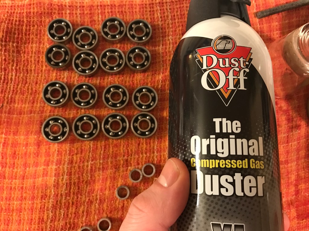 Bones will tell you that you can blast the bearings with compressed air, and if you’d like to you definitely can do that. We happened to have a can of air in the pantry so we gave each of these a quick blast to force out any remaining moisture from the wash cycle.
