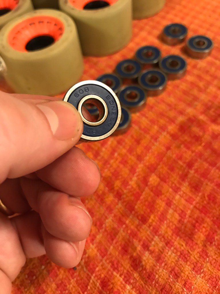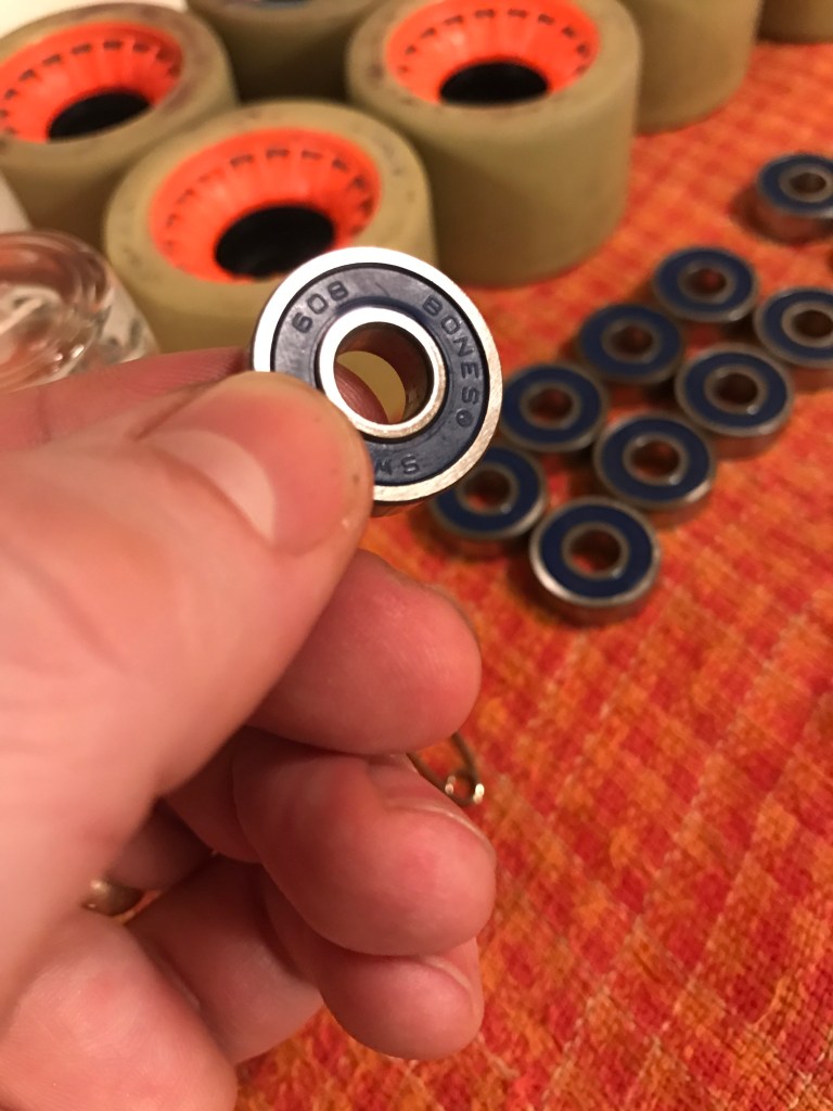 Press your thumb around the bearing to make sure the shield is completely back in place. Sometimes the edges need a little extra pressure to ensure they’re seated all the way around. That’s it, we’re done. Now these bearings are fresh and clean and ready to roll.